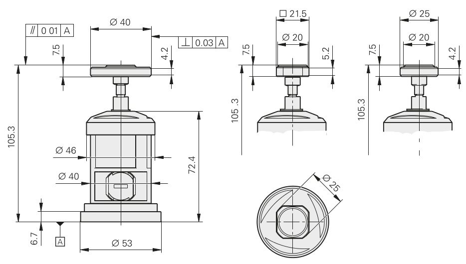 | Монтаж на столе станка | монтаж при помощи крепежных элементов (поставляются со щупом) монтаж при помощи монтажного цоколя (аксессуар) |
